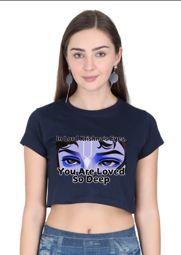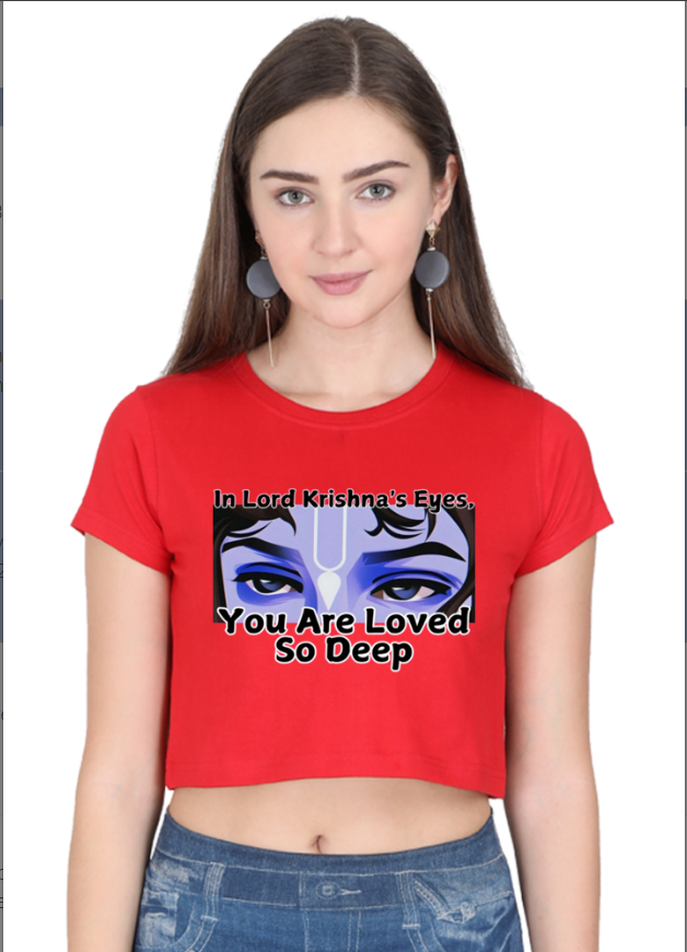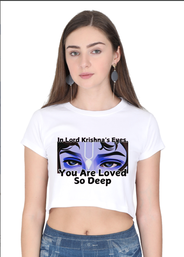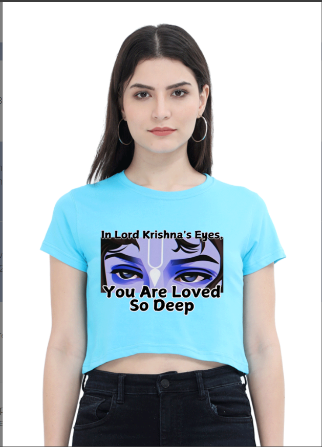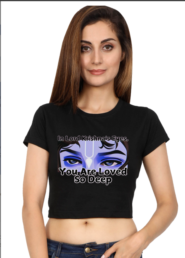 Let the enchanting gaze of Krishna’s eyes speak volumes with this uniquely designed crop top. Featuring a mesmerizing, artistic interpretation of Lord Krishna’s iconic eyes, this top captures both the wisdom and mysticism associated with the divine figure. Crafted from soft, breathable fabric, it combines comfort with style, making it perfect for daily wear or special occasions. Whether you’re attending a spiritual event, looking to add a spiritual touch to your wardrobe, or simply want to honor the profound symbolism of Krishna’s eyes, this crop top is a must-have for those who appreciate the beauty of divine design.